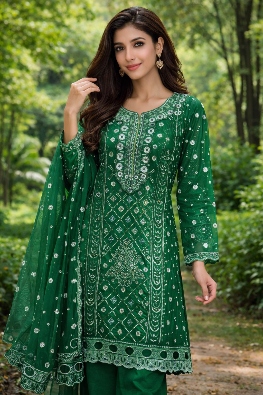 গাঢ় এমেরাল্ড সবুজ রঙের প্রিমিয়াম থ্রি-পিস, সূক্ষ্ম সিলভার এমব্রয়ডারি ও সিকুইন ডিটেইলিংসহ — ঈদ ও উৎসবের জন্য নিখুঁত গ্রেসফুল লুক।